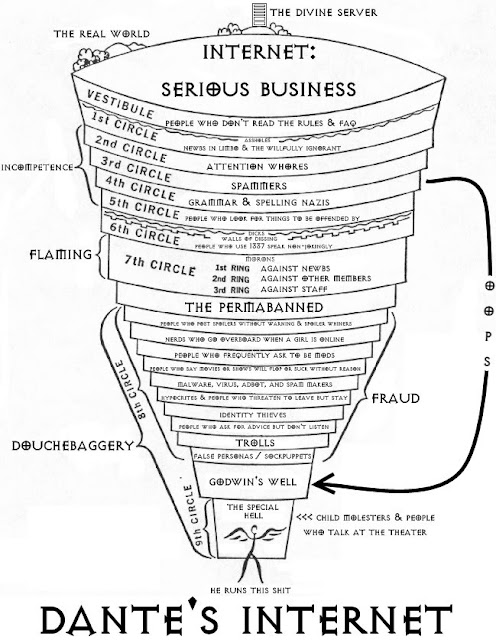 Here is an interesting picture showing what the Internet could be if it was categorized like Dante categorized the tortures of hell. Below is Dante's original 9 circles of hell